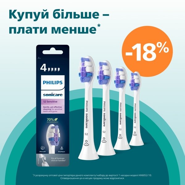 Обладая самыми тонкими щетинками в линейке чистящих насадок Sonicare (0,1 мм), S2 Sensitive обеспечивает одновременно бережный и эффективный уход за полостью рта.
