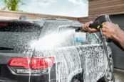 Налейте моющее средство Karcher в бачок распылителя, прикрепите наконечник к пистолету и нанесите пену.