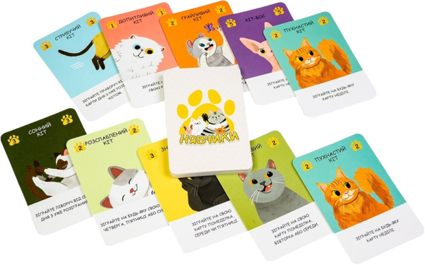 Нявчики (Cat Days) - быстрая карточная игра, где игроки планируют свою неделю, проводя время с мурлыкающими любимцами. Количество игроков зависит от количества экземпляров игры - одна коробочка рассчитана на 2 участников соревнования.