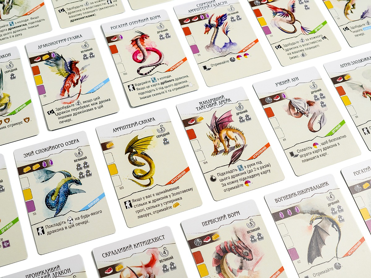 - Привлечь дракона: игрок платит ресурсы, чтобы побудить дракона с карты на руке переместиться в свободное место в пещере. Тогда дракон в пещере добавит новых возможностей в раскопках и получении победных баллов благодаря своим свойствам, указанным на его карте. Коврик игрока может содержать не более 12 драконов, а способности, которые позволяют менять драконов, встречаются редко, поэтому выбирайте себе квартирантов с умом.