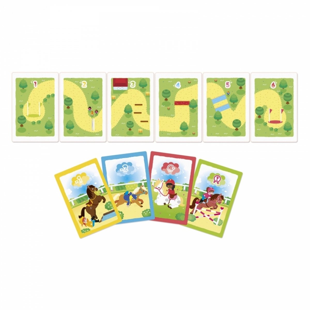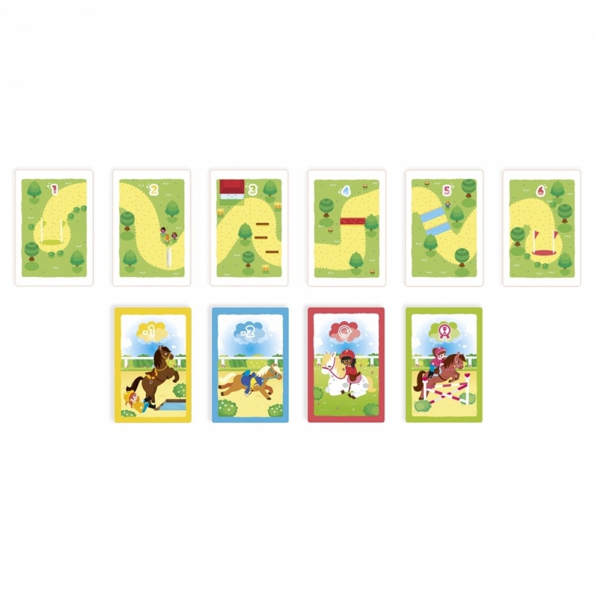 Увлекательная карточная настольная игра для 2-4 игроков от французского бренда Janod. Пришло время узнать, кто самый ловкий наездник! На пути к финишу будут встречаться преграды от соперников, поэтому необходимо быть хитрее их. В наборе 42 карточки с плотного картона. Рекомендуемый возраст: 5+.
