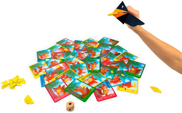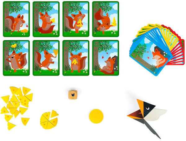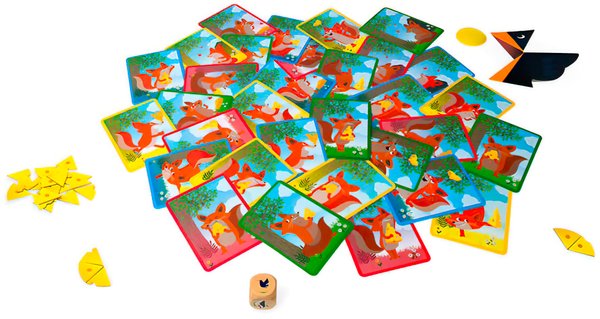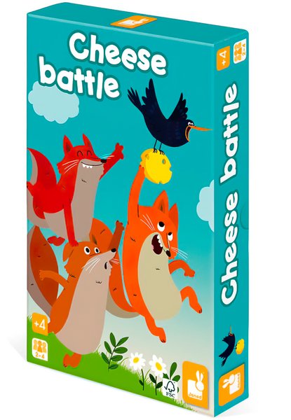 Настольная игра Сырная битва французского бренда JANOD - это огромное удовольствие, как для детей, так и для их родителей (от 2 до 4 человек). В набор входит 1 картонная кукла -ворон, 1 фетровый сыр, 32 карточки с иллюстрациями лис и рамками в 4 различных цветах (желтый, красный, зеленый и синий), 23 картонные жетоны сыра и 1 деревянный кубик с иллюстрациями ворона, на которых изображен способ, как игрок птицей должен переместить сыр из клюва, прежде чем бросить его на лисы. Другие игроки пытаются провести его над картами в своих цветах, чтобы сыр попал на них и они могли набрать очки - жетоны. Цель игры - получить 6 жетонов сыра. Побеждает тот игрок, который первым это сделает. Эта игра тренирует координацию движений, поддерживает отношения рук и глаз, учит терпению и концентрации.