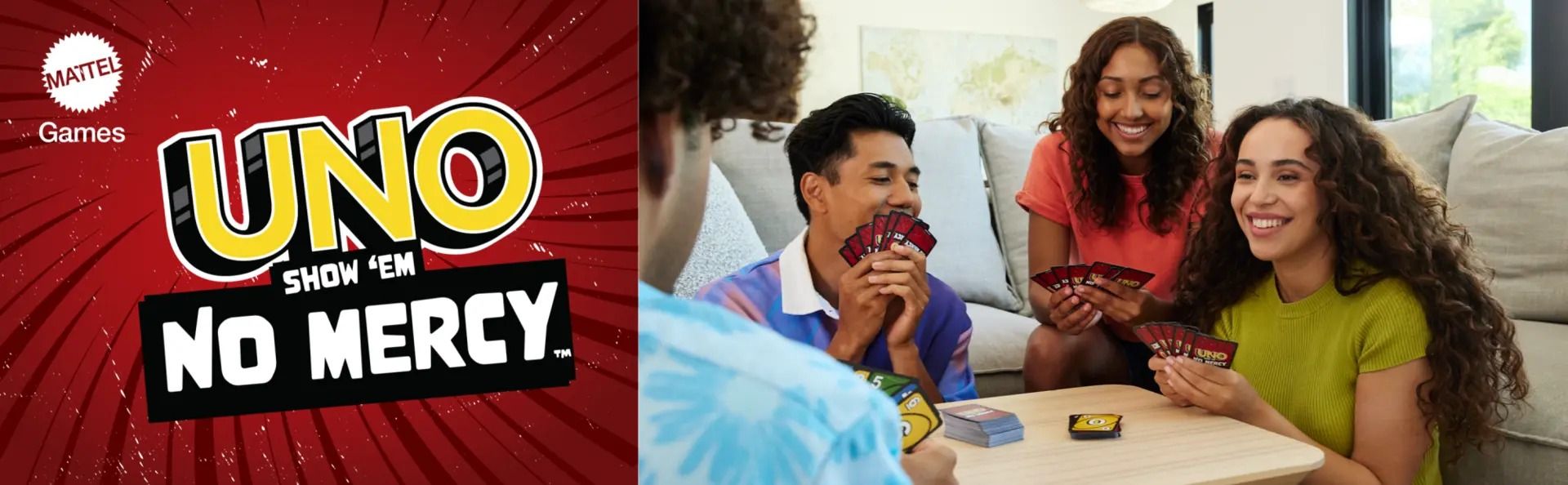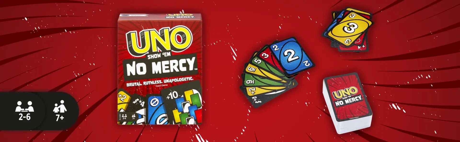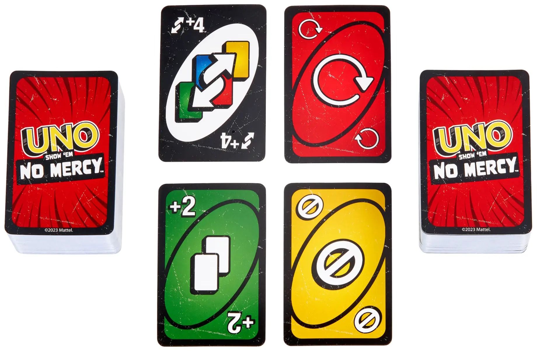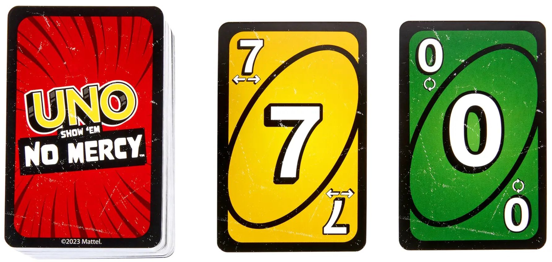 UNO No Mercy содержит на 56 карт больше, чем классическая UNO, включает особые правила, изменяющие игру, и несколько супер жестких Диких карт и карт действий, которые делают эту версию самой безжалостной в истории!