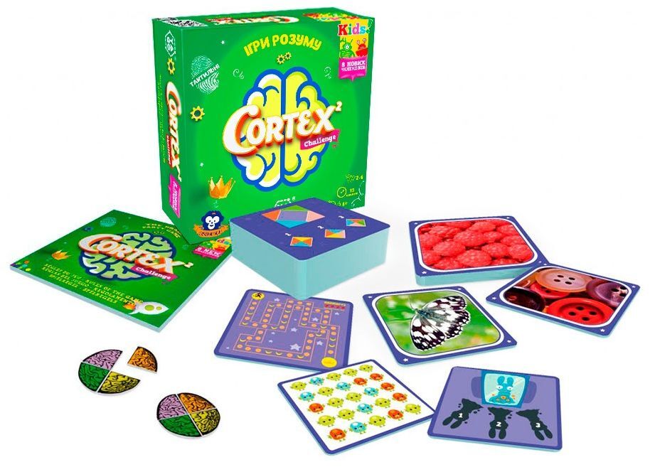Настольная игра - Cortex 2 Challenge бросает новый вызов разуму! Задание для деток теперь еще интереснее. Попробуйте быстрее остальных соперников найти зеркальное отражение рисунка или помогите обезьянке пройти лабиринт и посчитать бананы, а также найдите одинаковый рисунок из фигур, и многое другое. Цель игры - игроки выполняют задания, указанные на карточках и получают за это фишки. Тот, кто первым соберет по одной фишке каждого цвета, побеждает в игре.