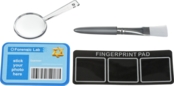 В комплекте находятся все необходимые инструменты, которые используют детективы для выявления отпечатков пальцев преступников.