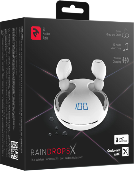 Полностью беспроводные наушники с кейсом для подзарядки, микрофоном и влагозащитой IPX5. Для подключения используется Bluetooth 5.0, а время автономной работы наушников составляет 5 часов. Кейс способен полностью зарядить наушники 3 раза, что увеличивает общее время работы RainDrops до 15 часов. Магнитная фиксация позволяет легко поместить вкладыши в кейс, а при извлечении происходит автоматическое соединение наушников с устройством. 2E RainDrops укомплектованы силиконовыми амбушюрами трех размеров и кабелем USB Type-C для зарядки кейса.