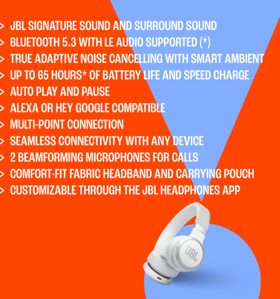 Накладные наушники JBL Live 670NC подарят вам не только мощный фирменный звук JBL Signature Sound, но и благодаря удобному оголовью — комфорт на протяжении всего дня. Когда вы погружаетесь в свою музыку, полное адаптивное шумоподавление с технологией Smart Ambient оградит вас от посторонних звуков. А когда вы захотите слышать всё вокруг, то сможете оставаться в курсе происходящих событий, продолжая слушать свою любимую музыку. Вы даже сможете вести беседу, не снимая наушников! Одним касанием чаши наушника получайте быстрый доступ к любимому голосовому помощнику, чтобы выбрать песню, отправить сообщение другу, проверить погоду и многое другое. Вы сможете наслаждаться музыкой целых 65 часов (с включенными Bluetooth и адаптивным шумоподавлением — 50 часов). А если вдруг понадобиться их подзарядить, то всего лишь за 5 минут быстрой зарядки можно продлить музыку еще на целых 4 часа! JBL Live 670NC могут быть одновременно подключены к двум Bluetooth-устройствам, поэтому вы никогда не пропустите звонок даже во время просмотра видео на планшете.