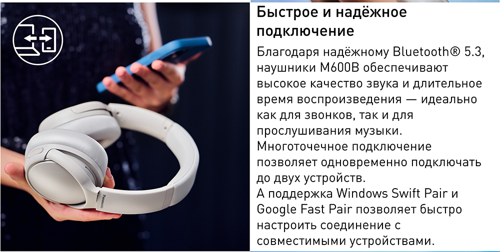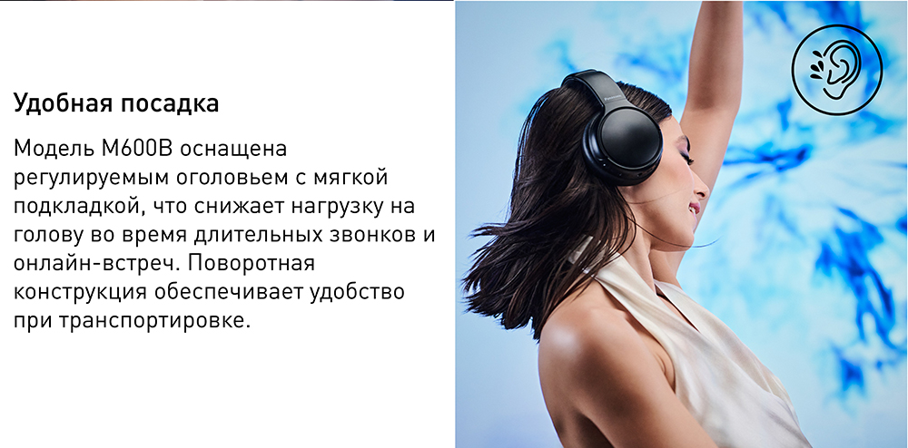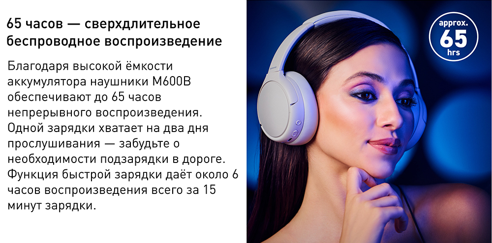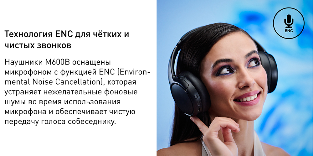 M600B обеспечивают четкое глубокое звучание басов и динамичный звук без нежелательных шумов, а также до 65 часов непрерывного беспроводного воспроизведения. Наушники имеют мягкие амбушюры и микрофон с технологией ENC для устранения шумов - идеально подходят для онлайн-звонков.