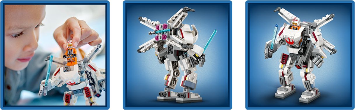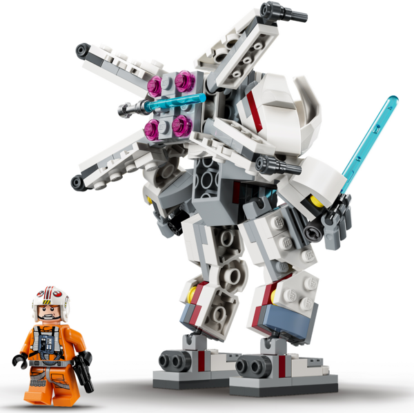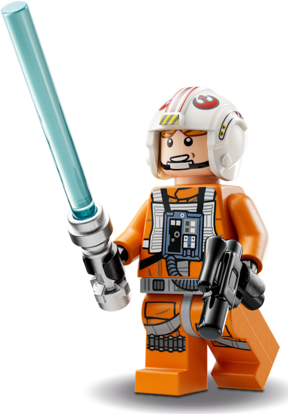 Открывающаяся кабина для минифигурки Люка Скайуокера, регулируемый реактивный ранец X-wing с зажимом для светового меча, а также захватывающие руки, чтобы держать большой световой меч и большой стреляющий шипами бластер.