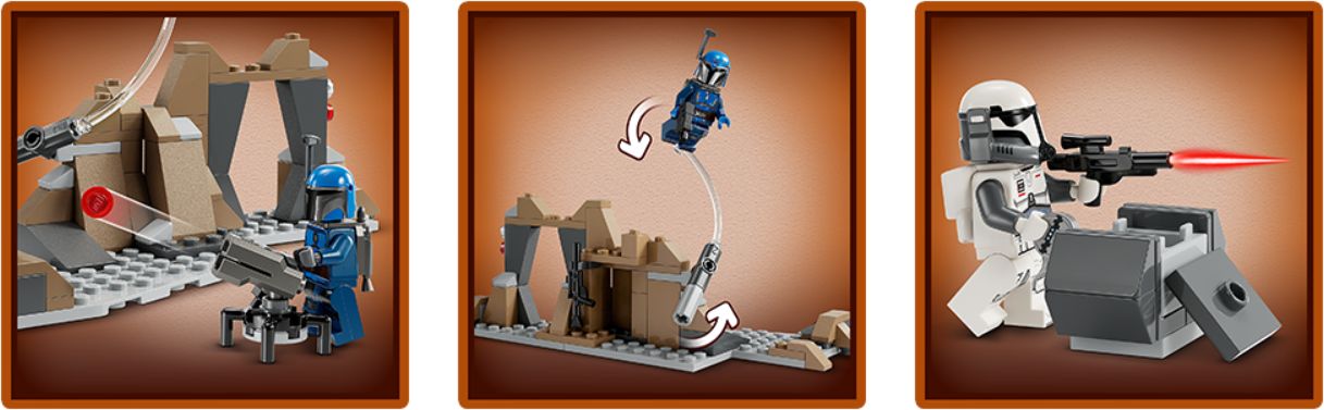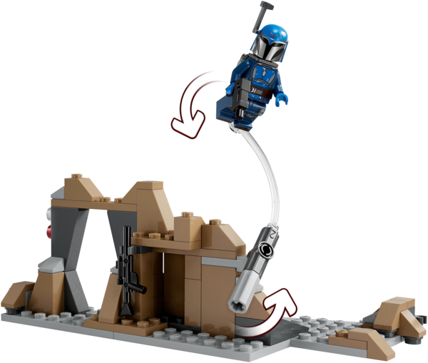 В наборе есть 4 минифигурки: мандалорца Nite Owl, мандалорского воина и двух имперских коммандос, а также множество аксессуаров, включая бластеры, бластерные пистолеты и элементы реактивных ранцев, а также прозрачный элемент с ручкой, чтобы заставить минифигурку «летать». Скальный массив с пещерой и пушка, стреляющая шипами, добавляют вдохновляющих игровых возможностей.