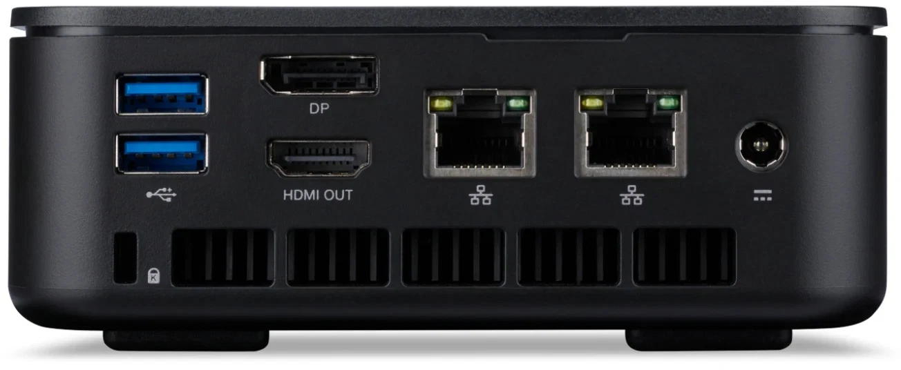 Acer Veriton N1502G-13N0U MFF выполнен в форм-факторе неттоп. Компактный корпус черного цвета подходит для размещения на рабочем столе, в нишах или за монитором в составе рабочих станций с ограниченным пространством. Процессор Intel N150 с частотой до 3,6 ГГц, 4 ядрами и 4 потоками ориентирован на базовые офисные приложения, веб-сервисы и работу с документами. Объем кэша 6 МБ и тепловой пакет 6 Вт обеспечивают энергосберегающий режим эксплуатации. Предусмотрен один слот SO-DIMM с поддержкой DDR4 3200 МТ/с объемом от 4 до 16 ГБ в одноканальном режиме. Для хранения данных доступен слот M.2 2280 PCIe с возможностью установки SSD от 128 ГБ до 1 ТБ. Конфигурация формируется в соответствии с требованиями инфраструктуры. Сетевые возможности включают два порта RJ45 Gigabit Ethernet, модуль Wi-Fi 6 и Bluetooth 5.2. Набор интерфейсов содержит USB 3.2 Gen 2 Type-C с поддержкой питания 5 В/3 А, порты USB Type-A разных поколений, HDMI 2.1 и DisplayPort для подключения современных дисплеев.