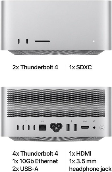 Mac Studio позволит создать студию вашей мечты с помощью массива из 12 высокопроизводительных интерфейсов, расположенных спереди и сзади для удобного доступа. Легко подключайте и отключайте камеру, внешний накопитель и другие устройства с помощью разъемов на передней панели. Посмотрите на картину в целом, подключив до четырех мониторов Pro Display XDR и один телевизор 4K. Также имеется разъем для наушников с поддержкой высокого импеданса.