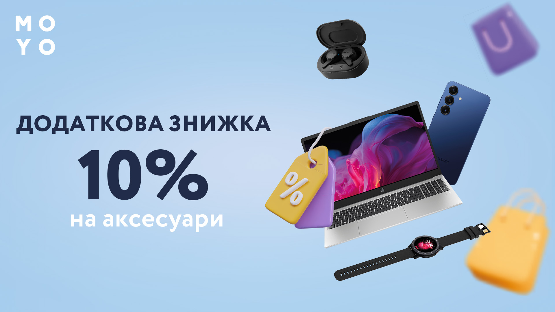 - Здійснити покупку в магазині MOYO з основного переліку товарів та отримайте 10% знижки на товар з розділу аксесуари в період з 30.07.2025 до 30.09.2025(включно)
