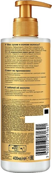 У вас сухие и ломкие волосы? Эксперты лаборатории L`Oreal Paris разработали уникальную формулу шампуня без сульфатов для деликатной очистки без пены. Наш шампунь-уход 3в1 с 6 ценными цветочными маслами подарит питание, гладкость и легкость Вашим волосам. Деликатно очищает как шампунь: формула без пены деликатно очищает волосы. Облегчит расчесывание как бальзам: разглаживающая кремовая текстура облегчает расчесывание и уменьшает ломкость волос. Интенсивно питает как уход: дарит интенсивное питание без отягощения.