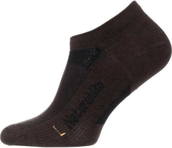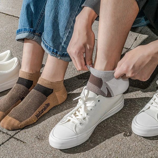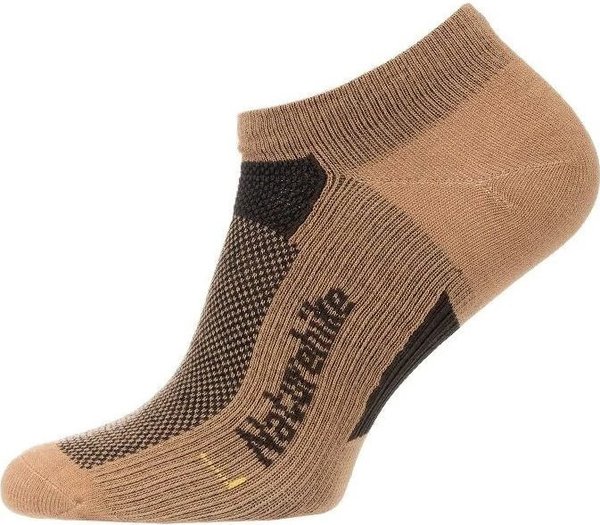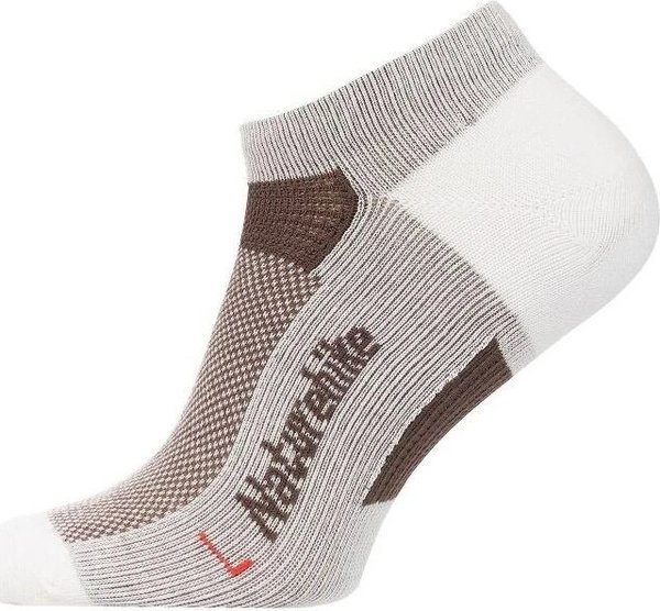 Носки изготовлены по специальному крою, который равномерно распределяет нагрузку по всем мышцам и обеспечивает стопам максимальный комфорт во время бега, скалолазания и пеших путешествий. В комплект входит две пары коротких носков бежевого и коричневого оттенка, которые имеют идентичный состав. Основа состава материала — волокно CoolMax, которое создается путем переплетения четырех полиэстеровых нитей с полой структурой. В результате получается износостойкое волокно с множеством пустот в сечении, через которые выделяемый кожей пот двигается к внешней поверхности материала, где быстро испаряется (скорость испарения примерно на 20% выше, чем у обычных тканей). Данное свойство помогает предотвратить намокание и переохлаждение ног во время интенсивных физических нагрузок. Характеристики волокна CoolMax дополняет нейлон, делающий материал более прочным и предотвращающий его растягивание и деформирование при частом ношении и стирке. Хлопок придает изделию мягкость, а его воздухопроницаемость позволяет сохранять оптимальную температуру тела. Небольшое добавление спандекса улучшает качество посадки носков на ноге, предотвращая их скатывание во время движения. Носки имеют уплотнительные вставки в области пальцев во избежание их натирания. В верхней части носков присутствует тонкая сетчатая зона, которая улучшает воздухопроницаемость. Анатомическая стопа для амортизации минимизирует риск возникновения микро разрывов и болей в области свода стопы при длительных занятий спортом. Плотная посадка от пятки до щиколотки оказывает компрессионный эффект. Данные носки имеют размер M, который подходит для обладателей ноги размером 36-39. Каждое изделие идет с маркировкой L (левый) или R (правый).