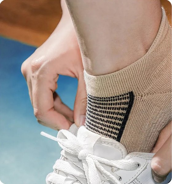 Носки изготовлены по специальному крою, который равномерно распределяет нагрузку по всем мышцам и обеспечивает стопам максимальный комфорт во время бега, скалолазания и пеших путешествий. В комплект входит две пары коротких носков бежевого и черного оттенка, которые имеют идентичный состав. Основа состава материала — волокно CoolMax, которое создается путем переплетения четырех полиэстеровых нитей с полой структурой. В результате получается износостойкое волокно с множеством пустот в сечении, через которые выделяемый кожей пот двигается к внешней поверхности материала, где быстро испаряется (скорость испарения примерно на 20% выше, чем у обычных тканей). Данное свойство помогает предотвратить намокание и переохлаждение ног во время интенсивных физических нагрузок. Характеристики волокна CoolMax дополняет нейлон, делающий материал более прочным и предотвращающий его растягивание и деформирование при частом ношении и стирке. Хлопок придает изделию мягкость, а его воздухопроницаемость позволяет сохранять оптимальную температуру тела. Небольшое добавление спандекса улучшает качество посадки носков на ноге, предотвращая их скатывание во время движения. Носки имеют уплотнительные вставки в области пальцев во избежание их натирания. В верхней части носков присутствует тонкая сетчатая зона, которая улучшает воздухопроницаемость. Анатомическая стопа для амортизации минимизирует риск возникновения микро разрывов и болей в области свода стопы при длительных занятий спортом. Плотная посадка от пятки до щиколотки оказывает компрессионный эффект. Каждое изделие идет с маркировкой L (левый) или R (правый).