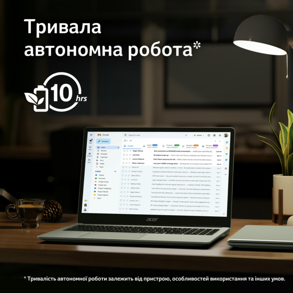 10 часов автономной работы, чтобы вы успели все! Одна зарядка утром - и ноутбук благодаря мощной батарее будет функционировать целый учебный или рабочий день, так что адаптер питания вам не понадобится.