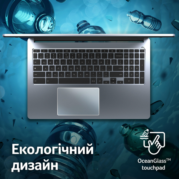 Chromebook оснащен сенсорной панелью OceanGlass - гладкой, как стекло, красивой на вид и приятной на ощупь. А изготовлена она исключительно из переработанных пластиковых отходов. Использование для производства панели OceanGlass выловленных в океане пластиковых отходов помогает уменьшить количество пластика в мировом океане.