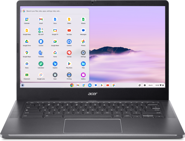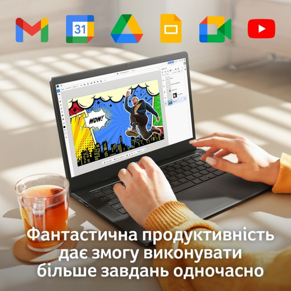 Ноутбук Chromebook Plus приятно удивит своей производительностью. Он отличается вдвое большим объемом памяти и емкостью накопителя. Кроме того, устройство поддерживает программы от компаний Adobe и Google на основе искусственного интеллекта, которые открывают перед пользователями множество новых возможностей.