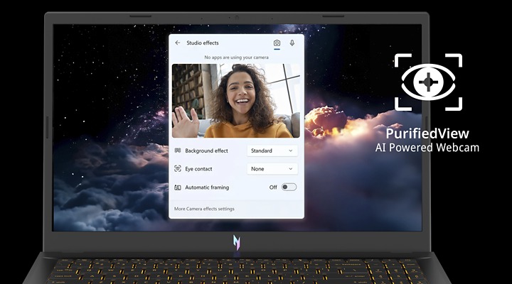 Пользуйтесь функциями автоматического кадрирования, усовершенствованного размытия фона и коррекции взгляда для видеозвонков с поддержкой ИИ, а также функцией Acer TNR, что обеспечивает более четкие изображения в условиях низкой освещенности.