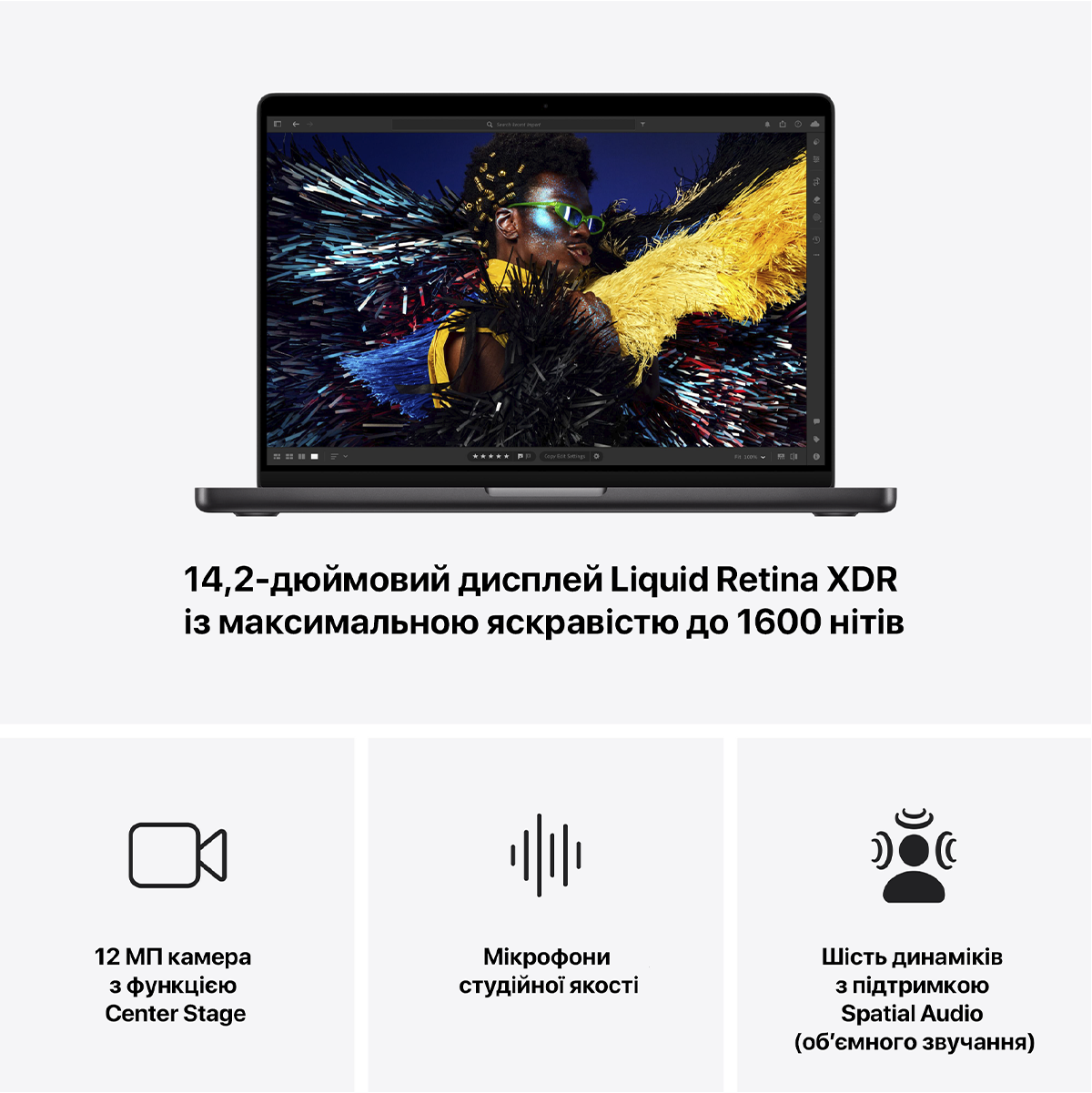 Дисплей Liquid Retina XDR 14,2 дюйма имеет максимальную яркость 1600 кд/м², до 1000 кд/м² постоянной яркости и контрастность 1 000 000:1.5 Также доступен вариант дисплея с нанотекстурой, которая минимизирует отражение света и блики.