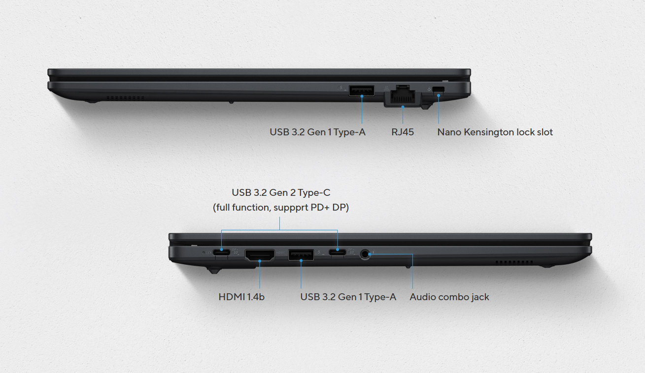 Ноутбук ASUS ExpertBook BM1 оснащен разнообразными портами для любых нужд. Среди них можно выделить два полнофункциональных порта USB 3.2 Gen 2 Type-C, поддерживающих режимы электропитания (Power Delivery) и вывода изображения (DisplayPort). Также есть два порта USB 3.2 Gen 1 Type-A для подключения USB-устройств, порт HDMI 1.4 для внешнего монитора и комбинированный 3.5-миллиметровый аудиоразъем для звукового оборудования. Слот Kensington Nano поможет защитить ноутбук от кражи, а разъем RJ-45 - подключиться к проводной сети.