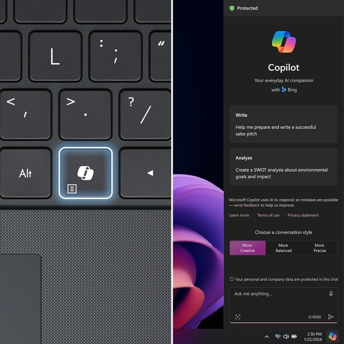 Copilot в Windows с защитой коммерческих данных - ваш надежный помощник с искусственным интеллектом. Повышайте свою производительность с Copilot и достигайте большего, затрачивая меньше времени и усилий. Воспользуйтесь помощником с помощью специальной клавиши Copilot. Всего одно нажатие для множества открытий.
