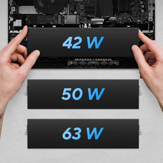 Конструкция ASUS ExpertBook BM1 облегчает его обслуживание. Нижняя панель корпуса крепится лишь четырьмя винтами, а крепление аккумулятора осуществляется без винтов. Устройство совместимо с аккумуляторами различной емкости, которые можно легко заменять.