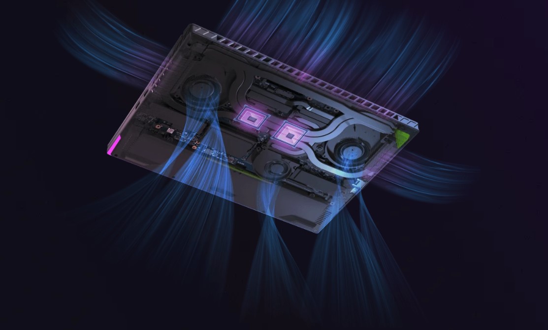 Важной составляющей качественного ноутбука является система охлаждения. Система из трех вентиляторов обеспечивает высокоточную вентиляцию, направляя воздух непосредственно на горячие чипы, что повышает эффективность охлаждения по сравнению с традиционными вариантами. Дополнительный третий вентилятор направляет горячий воздух от графического процессора к радиаторам, чтобы ноутбук оставался холодным во время длительных игровых сессий.