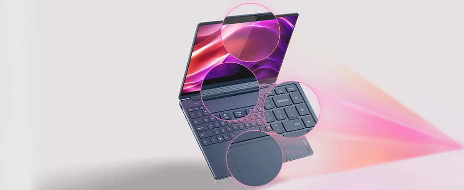 Встречайте Premium Suite с обновленной клавиатурой, созданной для комфорта и точности — ход клавиш 1,5 мм, выемки клавиш 0,3 мм и прочное покрытие Yoga. Вращающаяся звуковая панель с 4 динамиками Dolby Atmos окружает вас звуком. Микрофоны с шумоподавлением обеспечивают кристально чистый звук. Кроме того, веб-камера FHD IR с Windows Hello делает вход в систему быстрым и безопасным.