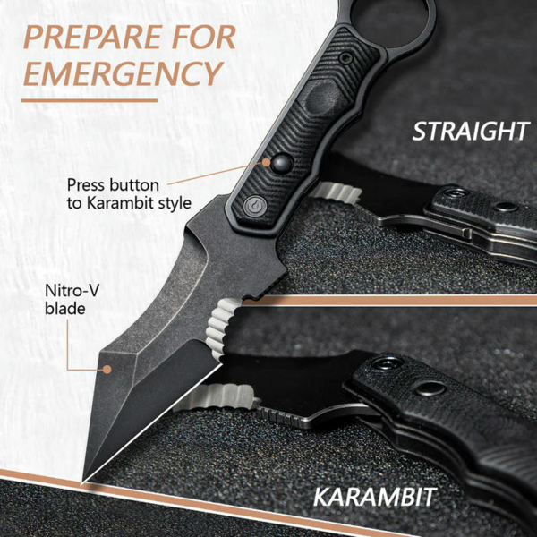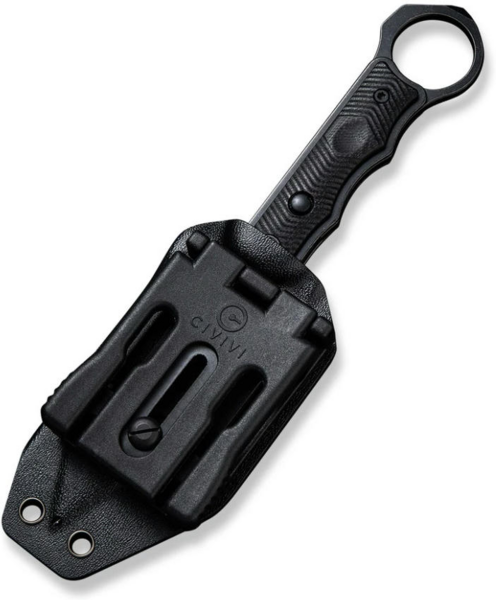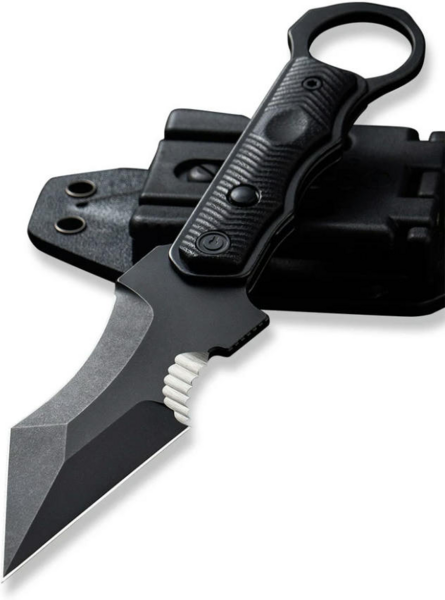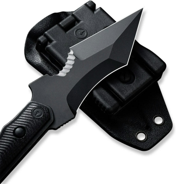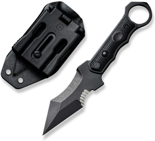 Тактический нож от Civivi предусматривает установку клинка в одном из двух положений на выбор: в классическом прямом или под наклоном около 45° в стиле керамбит. Наклон лезвия с последующей фиксацией осуществляется нажатием кнопки. В производстве клинка использована сталь Nitro-V твердостью 58-60 HRC. Марка пользуется высоким спросом благодаря сбалансированному составу с включением ванадия и азота, которые усиливают положительные свойства хрома и углерода, повышают коррозионную стойкость металла и его прочностные характеристики. Клинок отличается неоднородной поверхностью, которая является результатом закалки (stonewash) металла на финишном этапе производства. Обработка делает металл матовым, поэтому на нем не так заметны отпечатки пальцев и мелкие потертости.