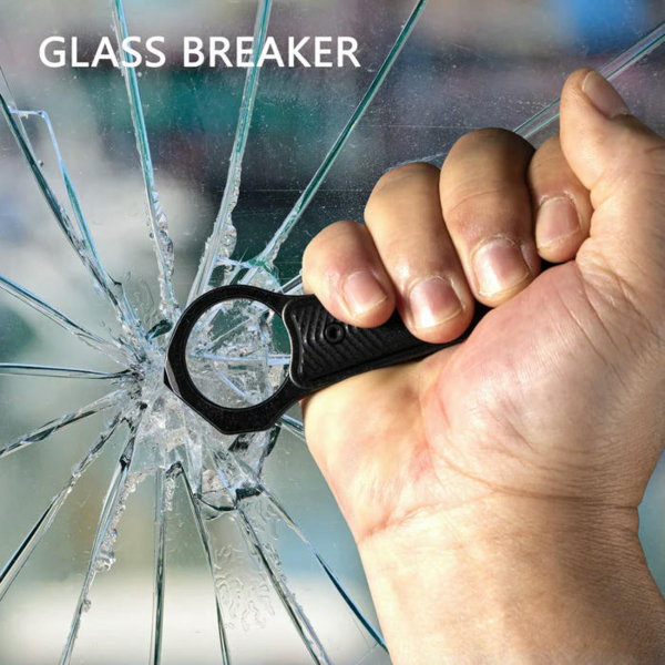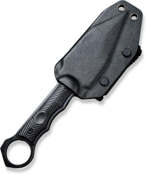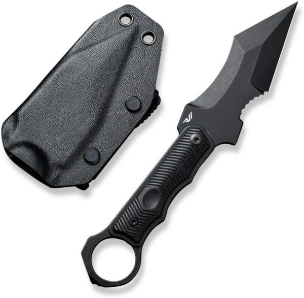 Клинок имеет двустороннюю заточку и тонкое острие, что улучшает проникающие возможности ножа. Часть лезвия с серрейторной кромкой предназначена для резки волокнистых материалов, например, шнуров и строп. Чтобы модель длиной 204.8 мм не выскальзывала из руки, ее рукоятка дополнена парой накладок с ребристой поверхностью. Их материал - ударопрочный стеклотекстолит G10 черного цвета. Хвост рукоятки венчает широкое отверстие для темляка.