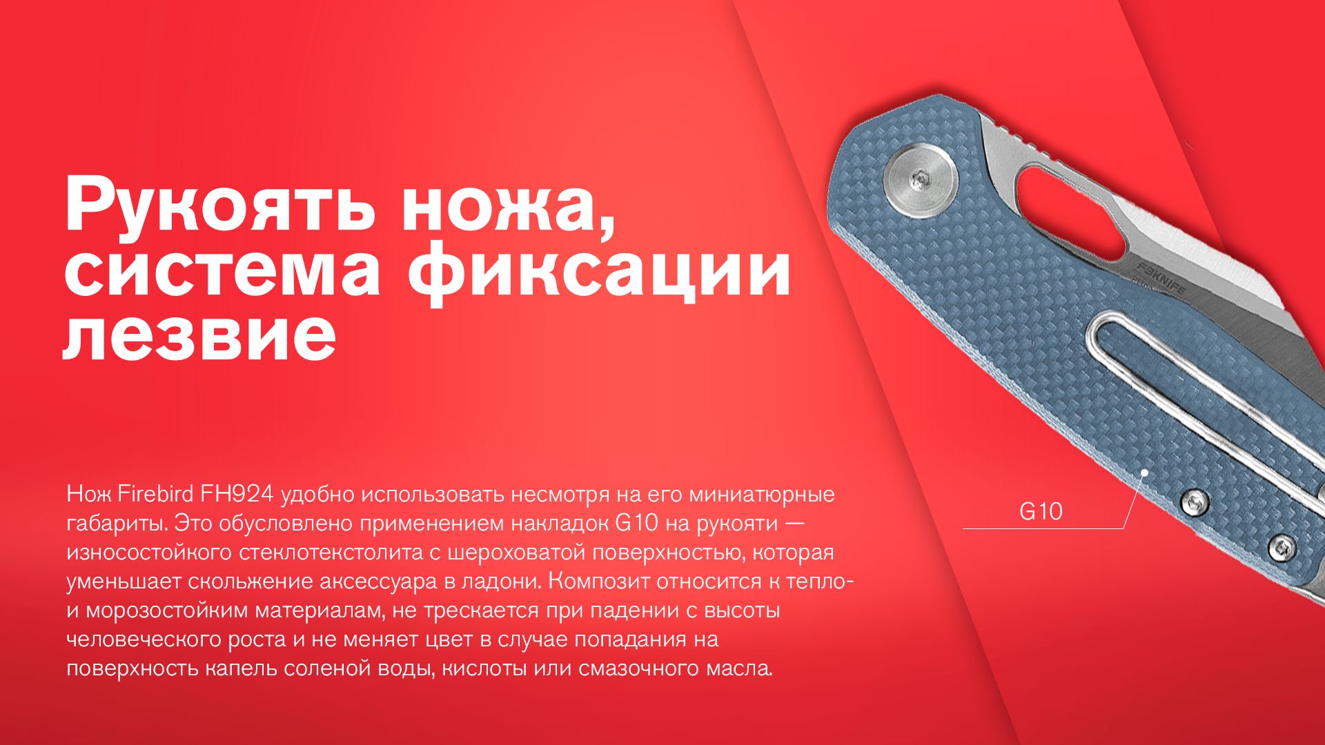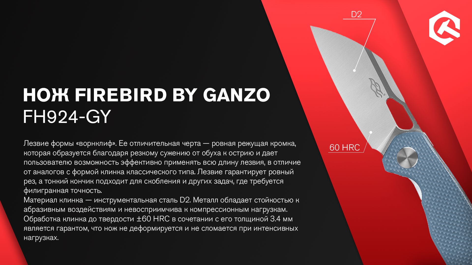 Нож Firebird FH924 подходит для любых видов деятельности, требующих острого и надежного в эксплуатации инструмента. Клинок из стали D2 имеет длину 65 мм и запирается с помощью замка Liner lock, выдерживающего нагрузку около 70 кг.