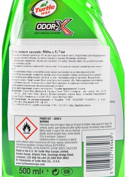 Нейтрализатор запаха Turtle Wax Power Out Odor-X 30 days 500 мл. Средство устраняет неприятные запахи в том числе и в системе кондиционирования – достаточно просто распылить небольшое количество средства в воздуховод. Избавьтесь от резких запахов в салоне автомобиля с помощью этого мощного спрея для устранения запахов. Благодаря инновационной технологии Odor-X, Odor-X Car уничтожает неприятные запахи, вызванные разливами кофе, пятнами еды, домашними животными и табаком, и оставляет свежий легкий аромат на срок до 30 дней. Вы можете купить нейтрализатор запахов Тартл Вакс, чтобы быстро и легко удалить запахи с автомобильных сидений, ковров, обивки и так далее.