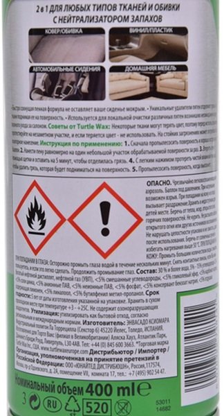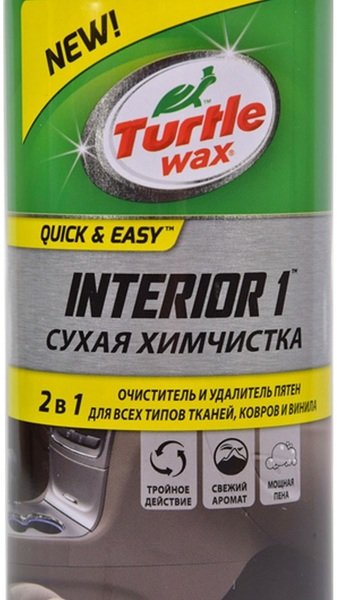 Сухая химчистка со щеткой Turtle Wax Interior 1 400 мл - это уникальный по природе действия и эффективности очиститель обивки. В процессе обработки на поверхности образуется обильная пена, проникающая глубоко внутрь покрытия. Она не только выталкивает грязь на поверхность, но и не позволяет ей двигаться обратно. Также она впитывает неприятные запахи и образует на поверхности антистатический защитный слой, предохраняющий от повторных загрязнений.