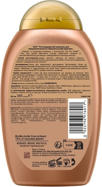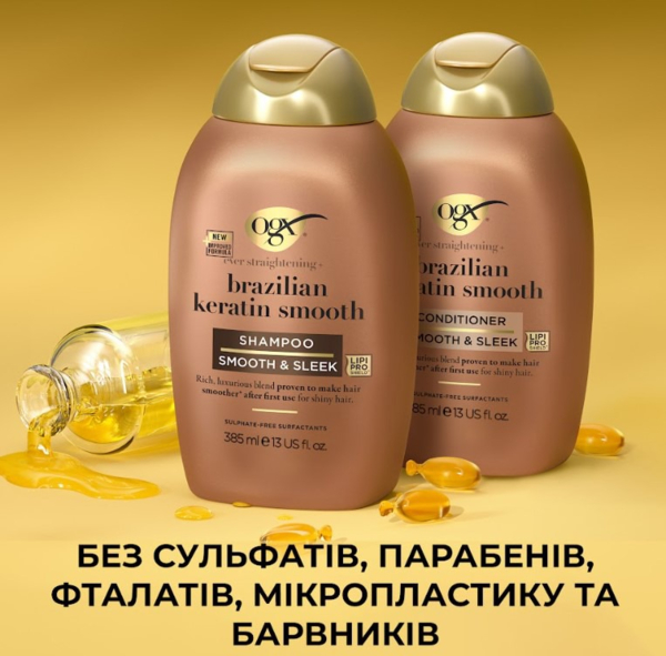 Волосы являются сложной структурой, состоящей из белков и липидов, которые формируют защитный барьер. Но ежедневные процедуры, такие как термическая укладка и химические обработки, могут нарушить эту оболочку, что приводит к повреждению и сухости. Формулы OGX разработаны для решения этих проблем, предоставляя очищение и кондиционирование, которые поддерживают естественные белки и липиды в волосах. OGX, ведущий бренд в сфере ухода за волосами в США, представляет обновленную формулу Lipi Pro Shield, которая гарантирует более здоровые волосы уже после одного мытья и предлагает вдвое большую защиту, чтобы волосы выдерживали все жизненные вызовы. OGX Ever Straightening + Brazilian Keratin Smooth Шампунь: Идеально подходит для густых и пористых волос. Увлажняет и разглаживает волосы с первого использования, помогая устранить пушистость, делая их гладкими и легкими в укладке. Состав обогащен маслом авокадо и натуральными экстрактами, чтобы усиливают естественный блеск и сияние волос, делая их вид и ощущение более здоровыми. В линейке дополнительно представлены шампунь и маска. Продукт не содержат сульфатов, фталатов и микропластика, а также имеет сбалансированный pH, нежно очищая и защищая естественный барьер и структуру волос.