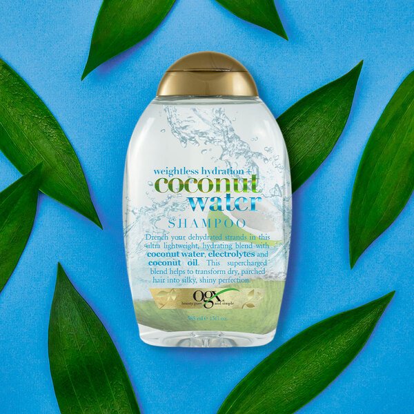 - Легкая формула шампуня OGX с кокосовой водой, электролитами и кокосовым маслом, увлажняет сухие волосы, делая их шелковистыми и блестящими.