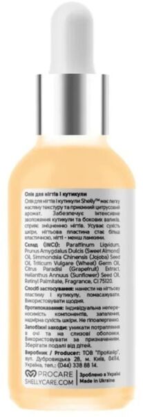 Ухоженная кутикула - один из шагов к безупречному маникюру. Масло для ногтей и кутикулы Shelly значительно облегчит уход за кутикулой и ногтевой пластиной, поддерживая ее опрятный вид. Активная формула средства способна глубоко проникать в кутикулу, смягчать ее, что благоприятно влияет на процедуру маникюра. Сочетание в составе средства ценных масел: миндального, жожоба, масла зародышей пшеницы, масла семян подсолнечника, комплексно влияет на состояние кожи и ногтевой пластины, питает и поддерживает оптимальный уровень влаги длительное время, делая кожу мягкой, а ногти - крепкими и здоровыми. Экстракт грейпфрута повышает регенерацию поврежденных клеток эпидермиса, оказывает противовоспалительное, антибактериальное действие. Витамин А возвращает коже и ногтевой пластине эластичность, прекрасно справится с проблемами обезвоживания и сухости. Приятный цитрусовый аромат средства сделает процедуру ухода за руками более приятной. Для получения максимального эффекта рекомендуется использовать масло ежедневно.