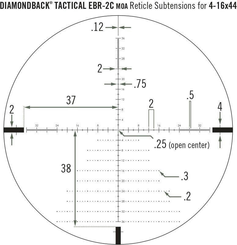 Оптический прицел Vortex Diamondback Tactical FFP 4-16x44 EBR-2C MOA (DBK-10026) с прицельной маркой EBR-2C, расположенной в первой фокальной плоскости объектива, позволяет стрелку в полной мере использовать высокоинформативную сетку EBR-2C для определения расстояния и подбора поправок по вертикали и горизонту на любой кратности увеличения. Прочный корпус, выполненный из цельного блока алюминия, оптическая система обеспечивает превосходное контрастное и яркое изображение. Открытые барабаны ввода поправок имеют достаточно низкий профиль, чтобы не мешать упаковке и транспортировке, однако они имеют плавный ход, и с ними очень удобно работать. Боковой барабан позволит выполнить отстройку от параллакса на дистанции от 10 ярдов (9,14 м) до бесконечности.