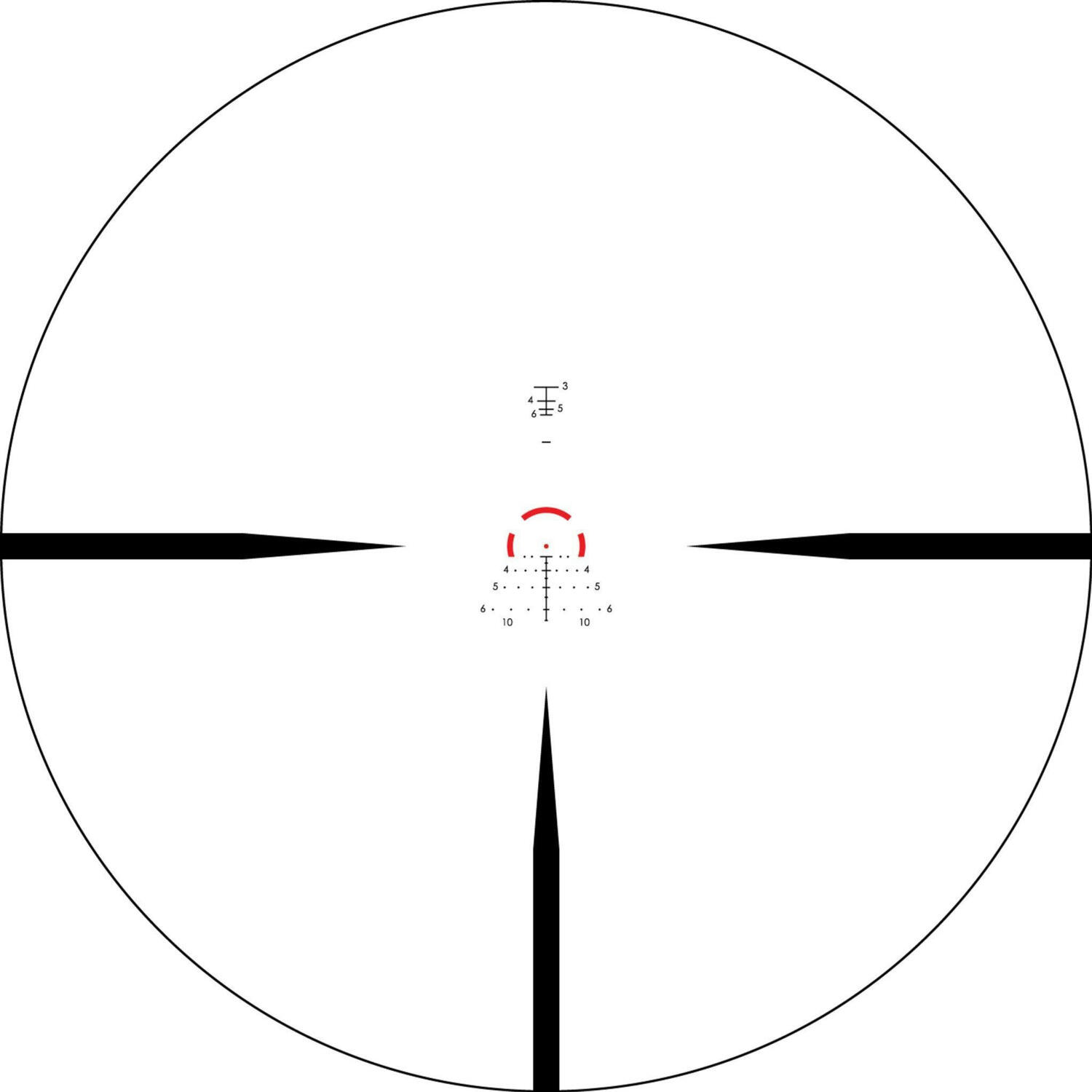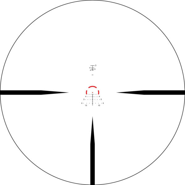 - Прицельная марка во второй фокальной плоскости. Масштаб прицельной марки остается неизменным при изменении кратности увеличения изображения. Приведенные ниже размеры прицельной марки можно использовать для измерения дистанции до цели, а также помогают учитывать поправки по высоте и на ветер при стрельбе на дальние дистанции.