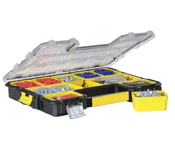 Удобный аксессуар для хранения различных болтиков. Отсеки между собой разделены таким образом, что если случайно перевернуть органайзер не произойдет смешивания болтиков. Пользуюсь органайзером от Stanley давно, закрывается надежно, хотя крепления фиксатора немного расшатались. Внутрь в закрытом состоянии влага не проникает, при хранении в гараже не появляется коррозии на болтах.
