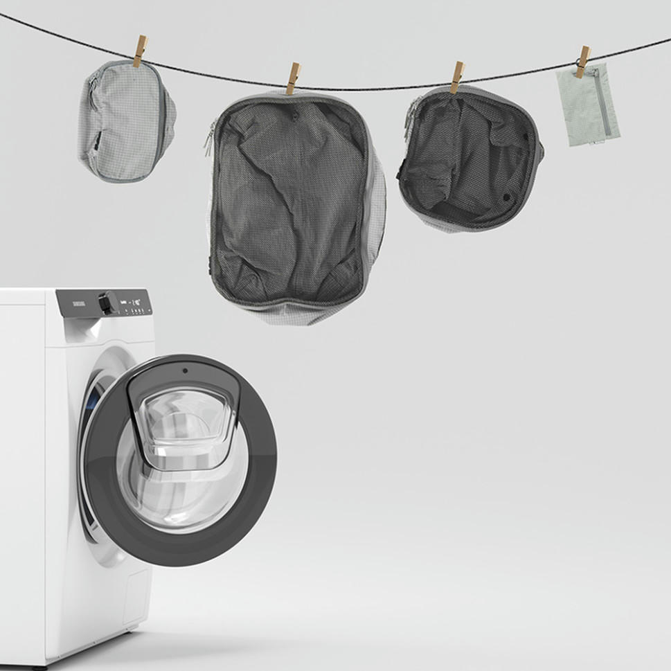 Изготовлен из нейлона 40D, материала, сочетающего легкость и высокую прочность. Ткань не мнется, не боится влаги и подходит для машинной стирки. Верхняя часть оснащена сетчатой вставкой, которая позволяет быстро найти нужные вещи без необходимости распаковывать все содержимое.