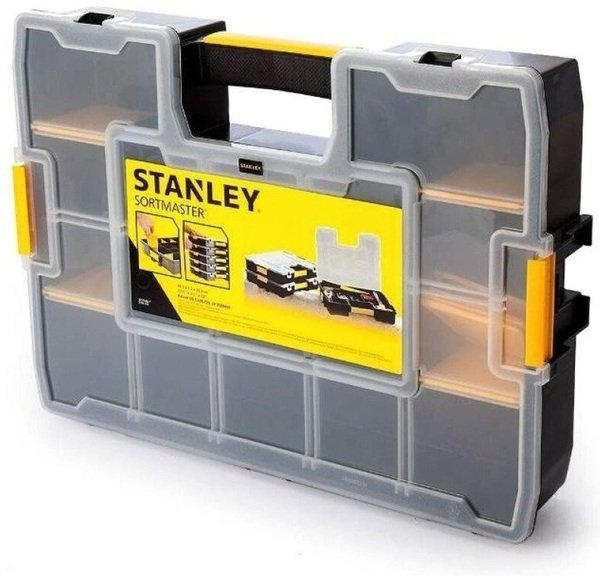 Органайзер Stanley Sort Master 1-94-745 с удобной ручкой и множеством отделений для инструмента будет полезен каждому мастеру. Перегородки можно снять и установить по своему усмотрению (возможно 1024 варианта). Ребра крышки стыкуются с перегородками и не дают содержимому пересыпаться. Прозрачная поликарбонатная крышка позволяет видеть инструментарий ящика. Размеры Stanley Sort Master 1-94-745 позволяют вмещать достаточное количество инструмента. Пустой органайзер весит 1065 г.