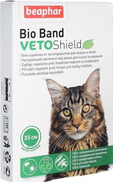 Ошейник «Bio Band» с натуральными маслами для кошек и котят с 2-месячного возраста. Отпугивает высасывающих кровь паразитов (блох, клещей, комаров), успокаивает зуд и раздражение кожи, устраняет неприятный запах животного. Натуральные растительные компоненты в составе ошейника постепенно высвобождаются и распространяются кожно-шерстным покровом животного. Постоянное ношение ошейника обеспечивает защиту от эктопаразитов в течение 4 месяцев. Обладает репеллентным действием, а также оказывает шерсти приятный аромат. Экстракт маргозы, содержащийся в ошейнике, кроме инсектицидного свойства, благоприятно действует на кожу – он обладает антибиотичным, антигрибковым и антивирусным эффектом, улучшает вид шерсти и уменьшает зуд от укусов. Длина ошейника: 35 см.