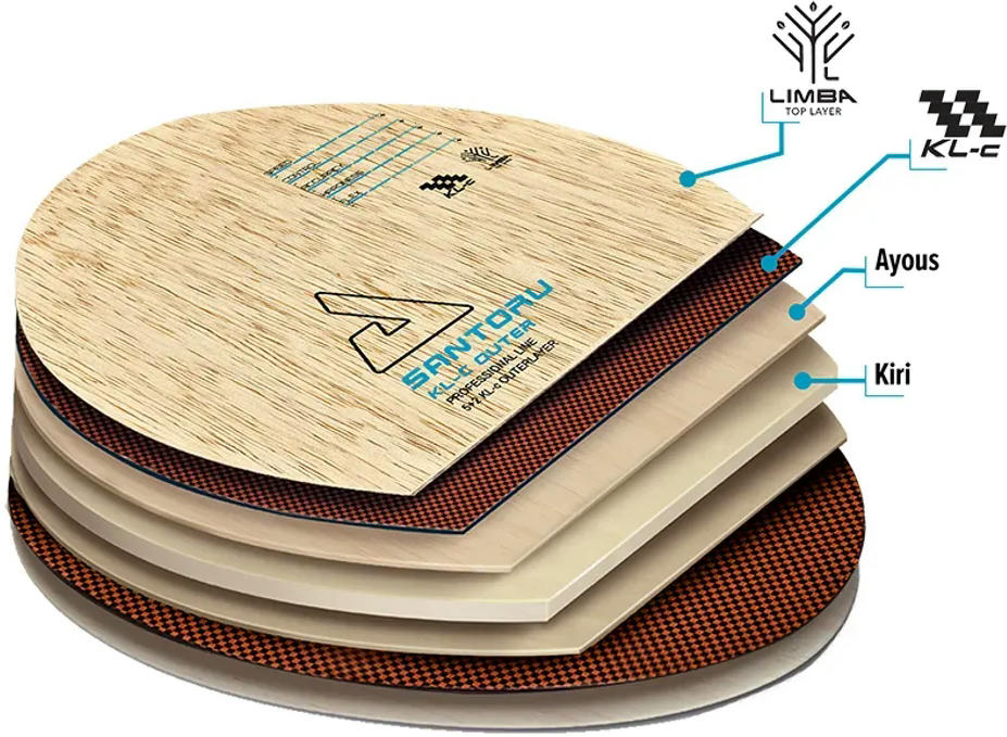 - Limba Top Layer - верхний слой в лезвиях (основания для ракеток) используется шпон из дерева Limba. Эта африканская древесина имеет более мягкую структуру (Monnin hardness = 2.4) по сравнению с популярной древесиной Koto. Тяжелая и быстрая, но не упругая, древесина Limba добавляет ощущение мягкости и превосходного контроля, необходимого современным игрокам в топспин. Верхний слой Limba является идеальной древесиной для ракеток, которые сфокусированы на ускорении мяча путем вращения. Дополнительным бонусом древесины Limba являются превосходные акустические свойства. Она создает чрезвычайно приятный звук, который напомнит вам о вашей любви к игре.