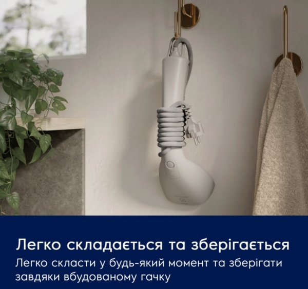 Отпариватель имеет встроенный крючок, благодаря которому его удобно не только хранить, но и откладывать в сторону во время отпаривания. Просто отложите его и не волнуйтесь, что остаточное тепло повредит поверхность. После использования закрепите его с помощью крючка.