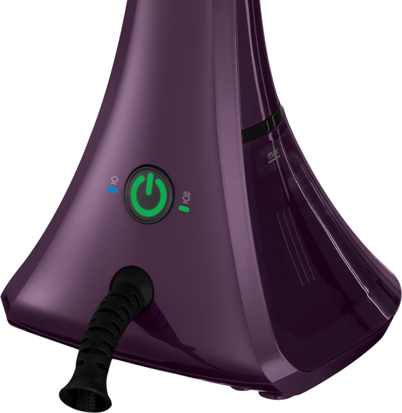 Оснащен простым двухцветным индикатором мощности подачи пара. Простым нажатием на курок подачи пара вы можете переключаться между синим цветом, предназначенным для деликатных тканей, и зеленым - для турбо-отпаривания. Быстро взглянув на цветной индикатор на задней панели отпаривателя, вы можете проверить настройки и перейти к следующему предмету одежды.