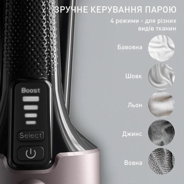 Цей відпарювач ефективний для швидкого розгладження складок на різних типах тканин, від делікатних (шовк, синтетика) до щільних (бавовна, льон, джинс). Завдяки потужному паровому удару він добре справляється навіть із застарілими заломами.