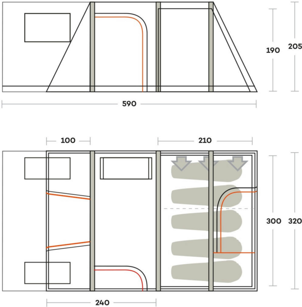 Основа каркаса состоит из трех независимых надувных арок, к которым уже присоединены внешний тент и внутренняя палатка, что в разы ускоряет и упрощает установку. Три отдельных входа выделяют эту модель среди многих других кемпинговых палаток, значительно упрощая и делая более комфортным длительное проживание в ней.