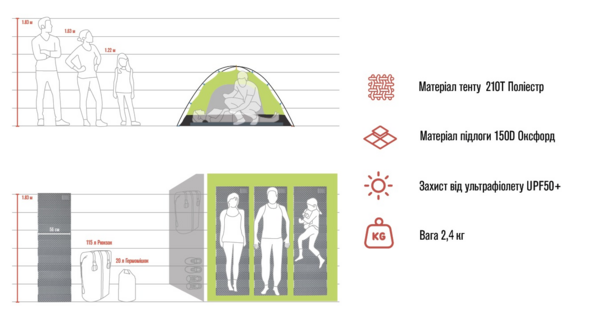 | Дополнительно | Каркасные палатки, Палатки двухслойные трехместные |